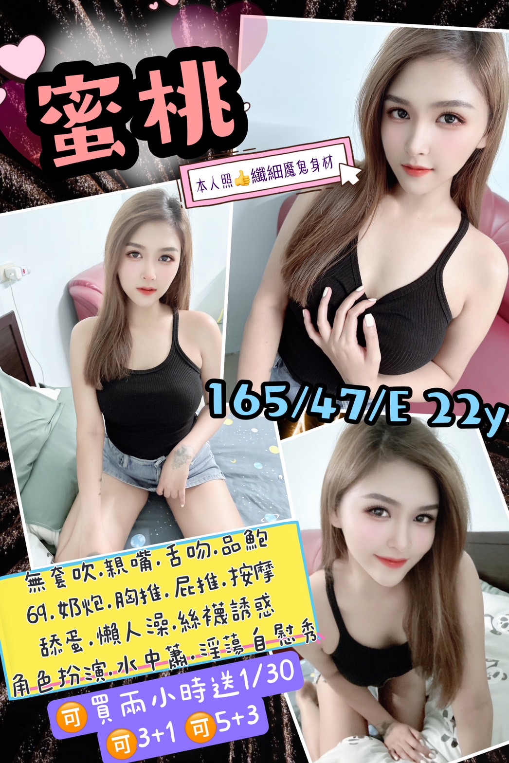 無套吹/親嘴舌吻(嘴巴乾淨清潔)/69/品鮑/奶炮胸推(需先告知)