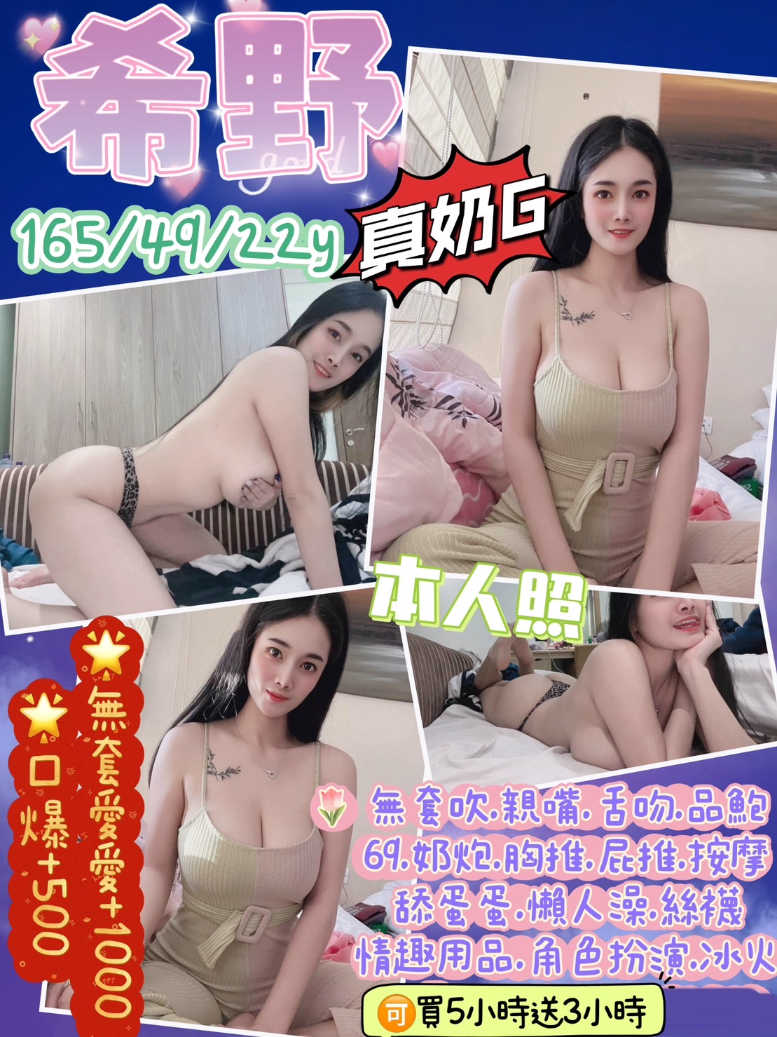 無套吹/親嘴舌吻(嘴巴乾淨清潔)/品鮑/69/奶炮胸推(需先告知)