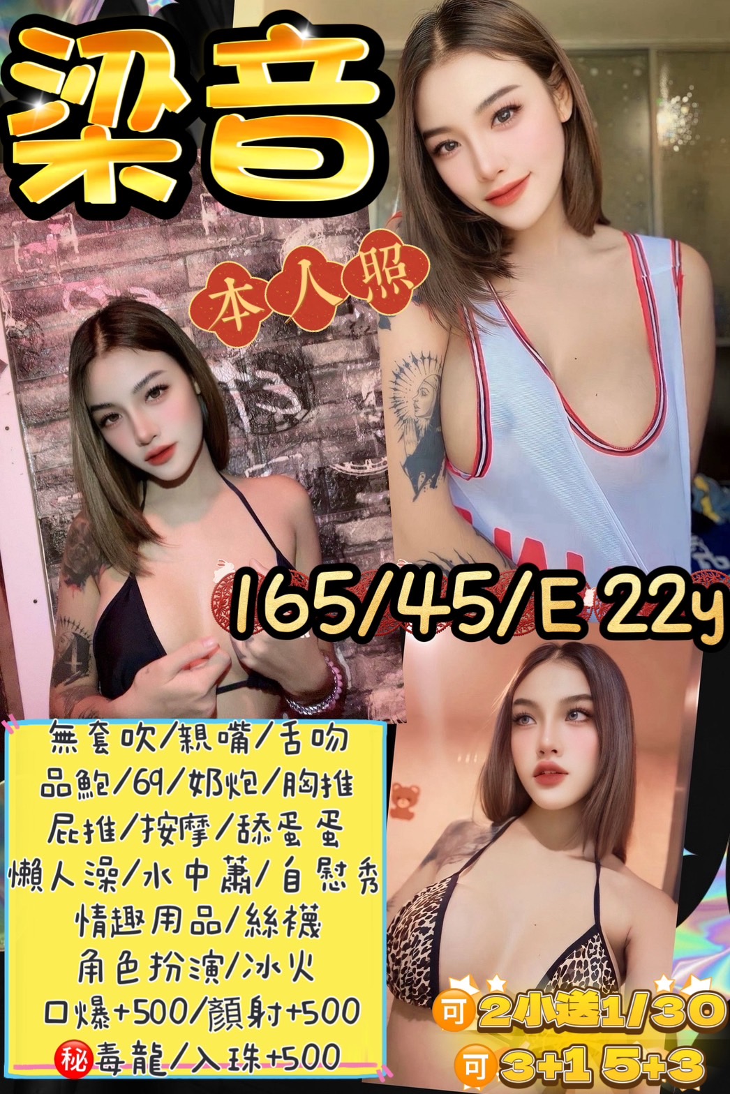 無套吹/親嘴舌吻(嘴巴乾淨清潔)/品鮑/69/奶炮胸推(需先告知)