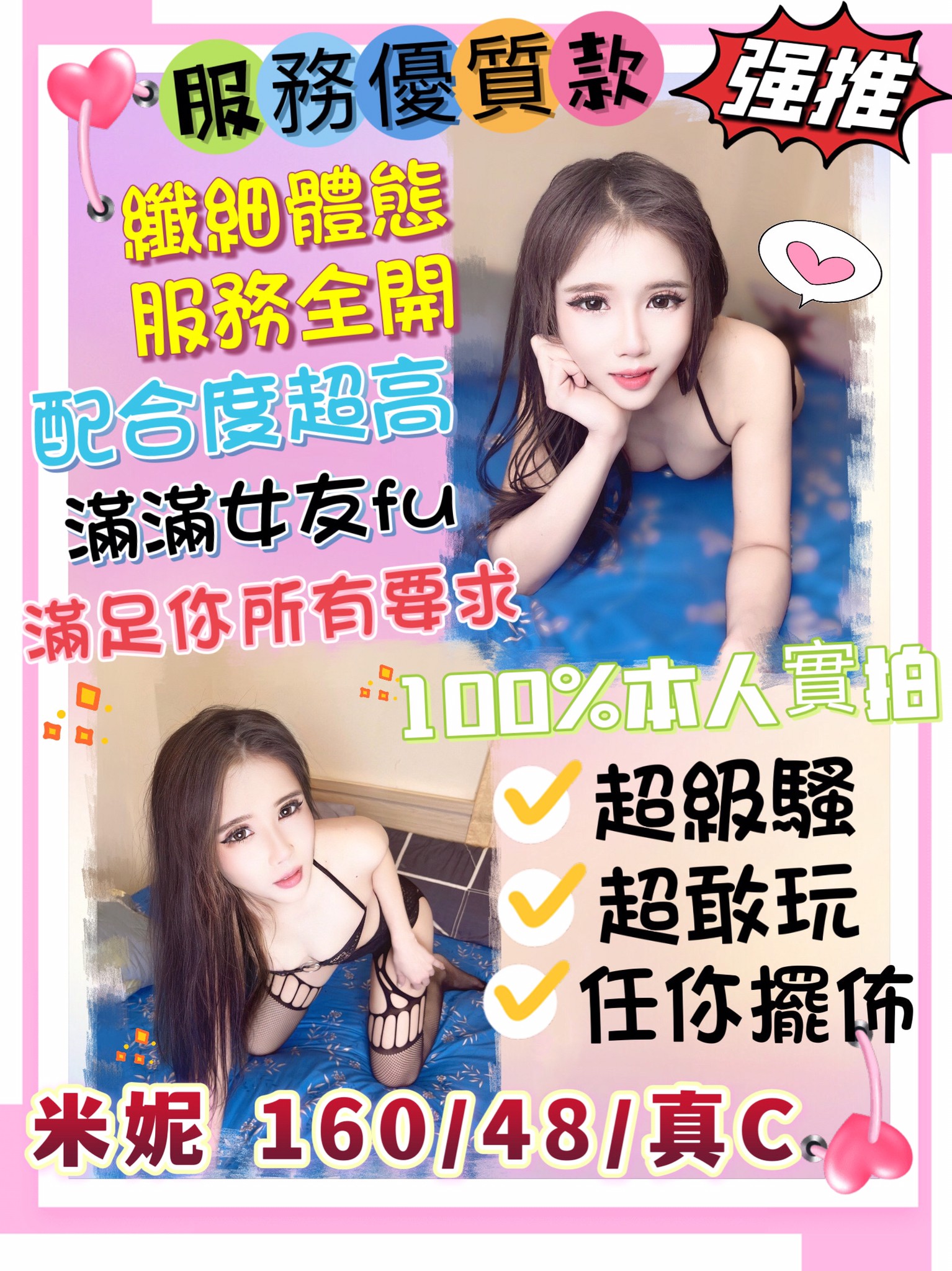 | 可服務項目 | 可攝影, 無套內射, 包夜, 可後門, 口爆, ■毒龍, 顏射 |