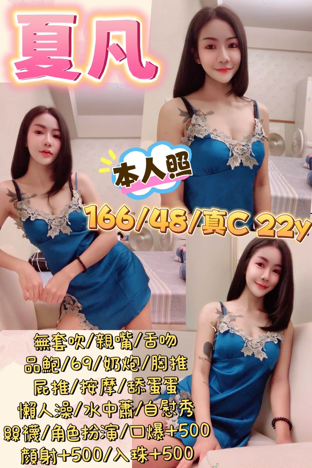 無套吹/親嘴舌吻(嘴巴乾淨清潔)/品鮑/69/奶炮胸推(需先告知)