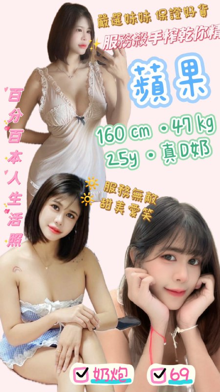 蘋果 (泰) 最強服務! 160 / 真D奶 / 25y / 47kg無套吹水中蕭 按摩奶泡六九胸推品鮑 絲襪(自備) 40分鐘/ 1s / 3200 60分…