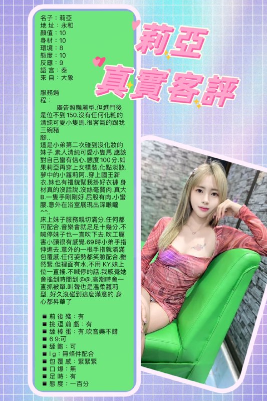 永和區 (近秀朗國小附近) 莉亞 (泰) 活潑少女 超小隻馬 27y 153 43 / 真D奶 共浴 無套吹 按摩 舌吻品鮑 69 奶炮按摩 水中蕭 絲襪(客…