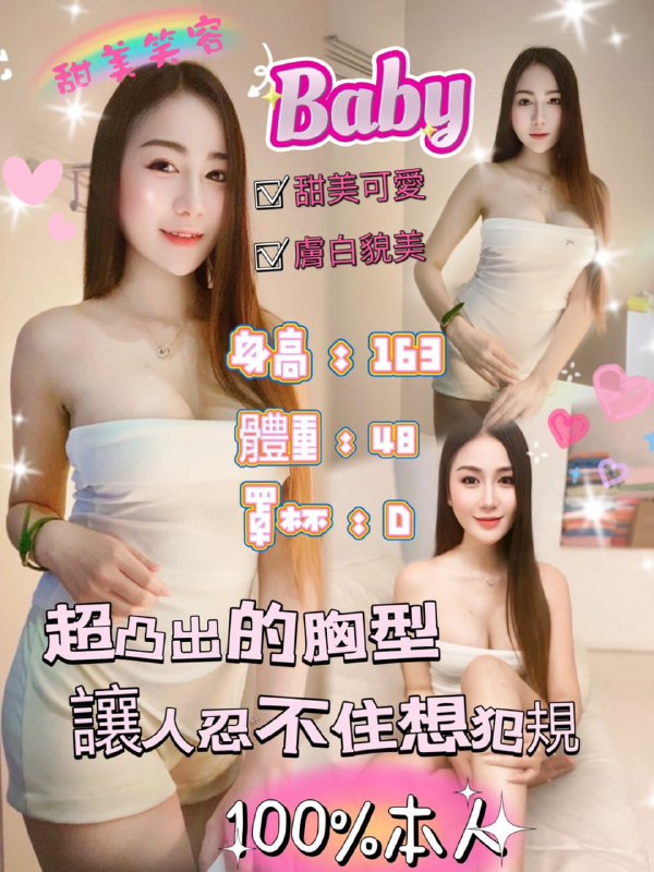 新妹 baby保證100%本人照163/24y/D服務項目無套吹/親嘴/舌吻/品鮑/六九/舔蛋按摩/奶泡/冰火/按摩/胸推/屁推加值服務口爆+500買2節送1節…