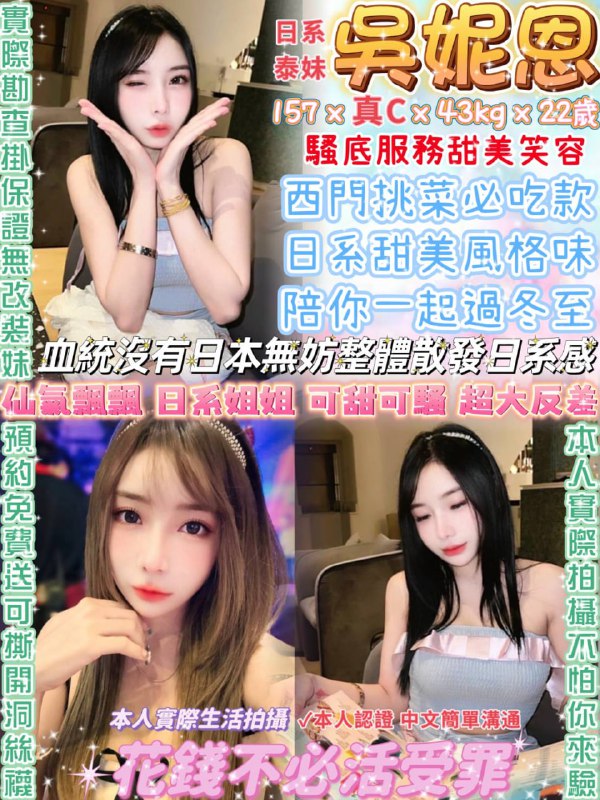 吳妮恩(泰)157/真C/43kg/22y不抽菸無牙套真奶無妊娠纹白虎皮膚白皙簡單中文基本溝通簡單英文溝通無套吹親親舌吻按摩胸磨臉絲襪胸推舔蛋共浴六九品鮑屁推加…