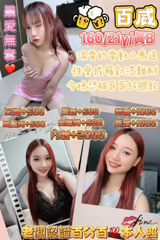 新妹 百威保證100%本人照 160/21y/真B服務項目無套吹/親嘴/舌吻/品鮑/六九/奶炮胸推/屁推/冰火/足交/絲襪(自備)加值服務口爆+500顏射+50…