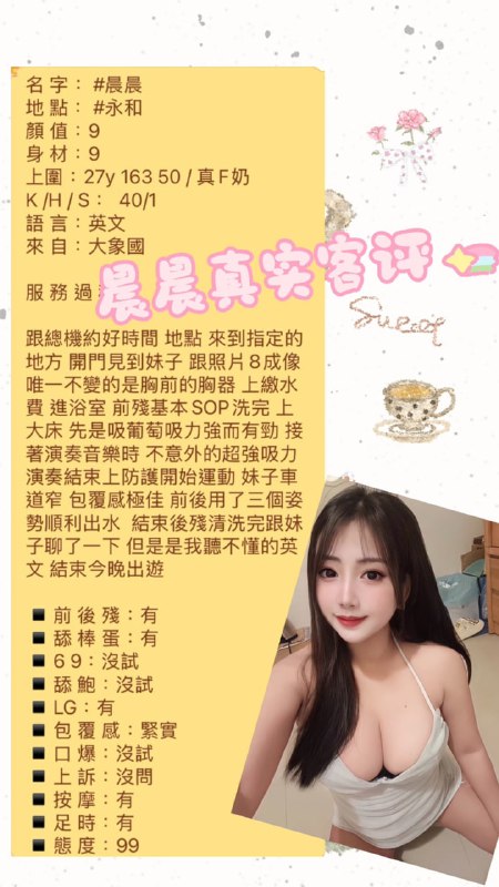 晨晨 (泰) 天然乳牛大眼妹重磅登場 27y 163 50 / 真F奶40min / 1s / 320060min / 1s / 370060min / 2s…