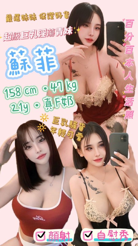 蘇菲 (泰) 超級巨乳淫蕩青妹 158 / 真 F 奶 / 21y / 47kg舌吻水中蕭 按摩奶泡胸推絲襪(自備) 自慰秀+500 射顏+500 40分鐘…
