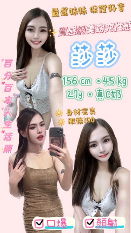 莎莎 (泰) 質感網美窈窕性感 156 / 真C奶 / 27y / 45kg無套吹舌吻水中蕭 按摩奶泡六九胸推絲襪(自備) 射顏+500 口爆+500 40分…